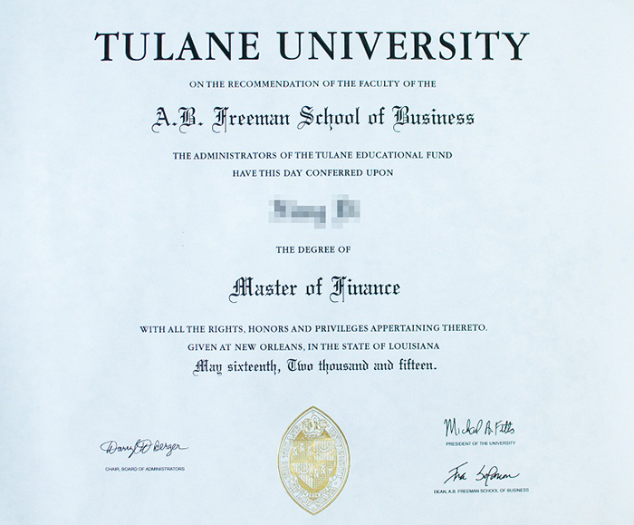 美国杜兰大学金融硕士(Master of Finance)学位证书