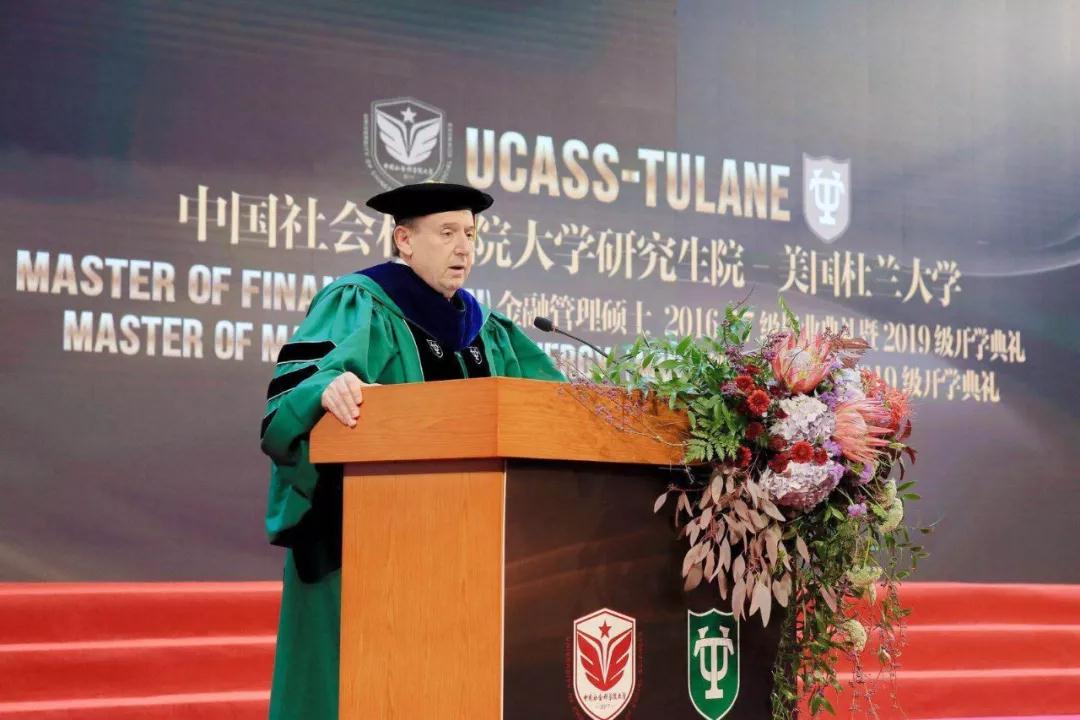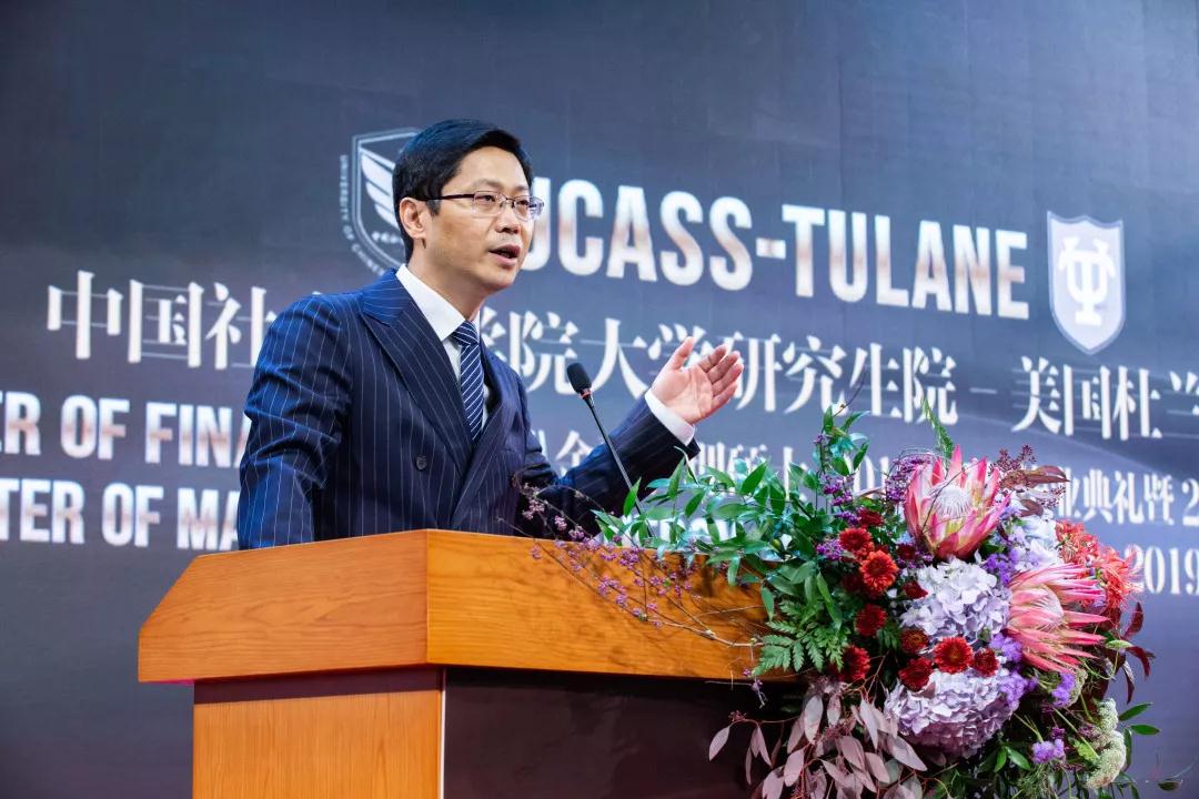 教师代表金融管理硕士项目首席课程顾问、中国社会科学院金融研究所副书记兼副所长胡滨,作为社科院研究生院-杜兰大学金融管理硕士项目的推动人,如何将中美教育的优势融入同一套课程设置中,一直是胡教授面对的挑战,在授课过程中,他和所有一流的学者一样,乐于接受任何创新与尝试。这次典礼胡教授在致辞中为学生讲解了中国目前金融环境的几个要素:金融要坚持党的领导、金融为实体经济服务、市场决定金融配置,并在最后用曾子的一句话勉励大家:“士不可以不弘毅,任重而道远。”