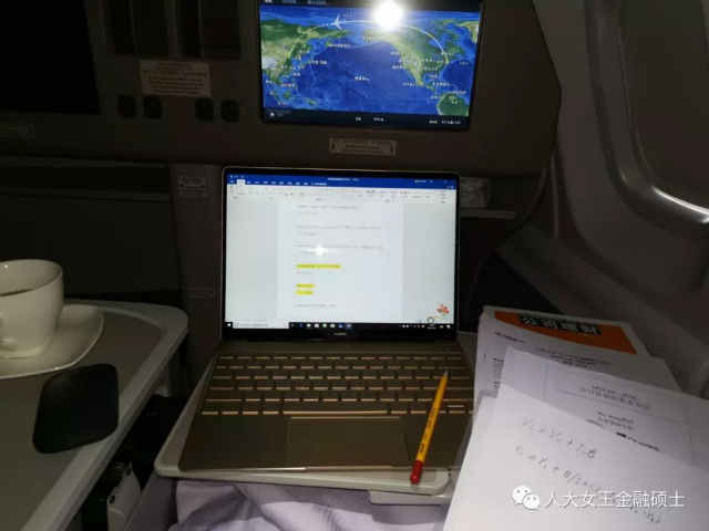 王炜教授给我们班上的第一次课与第二次课之间正好是五·一的三天小长假,而这段时间正好是我业务工作最繁忙的时候。我只能见缝插针地把两次国际出差一起安排在三天假期里。于是,我第一天从中国飞到欧洲,第二天从欧洲飞到美国,第三天从美国再飞回中国,三天绕地球一周。因为回来后马上就要上课和考试,我只能带上厚厚的课本和讲义在旅行途中做作业和复习。飞机上,我把自己的座位空间改装成了“‘人大-女王号’空中书房”,因为要做的习题实在太多,书的内容也是越看越多,我只得省却了几乎全部餐饮和娱乐内容,相当于又补了一整天的课。空姐看着这场景实在新鲜,一次次向我投来“怜爱”的问候。