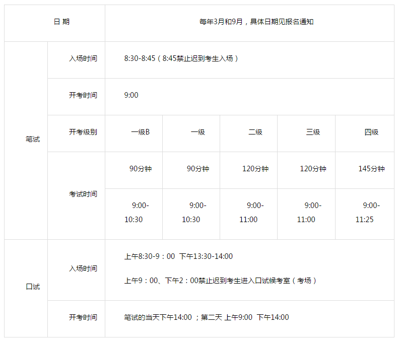 PETS一级至四级的考试时间为:每年3月和9月。3月开考内容为PETS一级B、一级、二级、三级,9月开考内容为PETS一级、二级、三级、四级。2020年上半年全国公共英语等级考试(PETS)时间及科目。