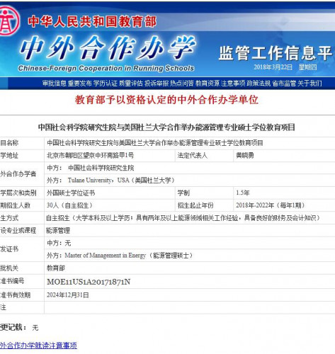 2018年1月,中国社科院研究生院与美国杜兰大学合作举办的第二个中外合作办学项目能源管理硕士(MME)项目获得教育部批准实施,并于4月开始正式招生