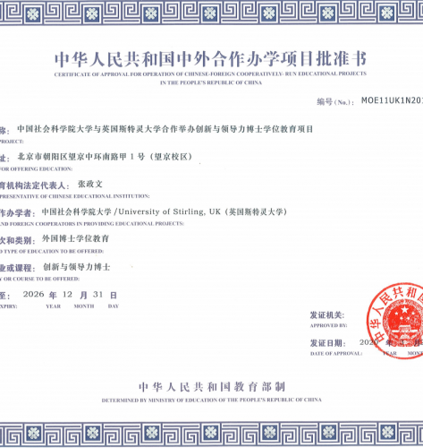 2020年11月29日,中国社会科学院大学与英国斯特灵大学合作举办的创新与领导力博士学位教育项目首期班开学典礼在北京隆重举行。这是中国社会科学院大学建校以来首个与英国高校合作开展的博士层次的中外合作办学项目,也是国内目前首个通过教育部批准办学的创新与领导力研究方向的博士学位项目。