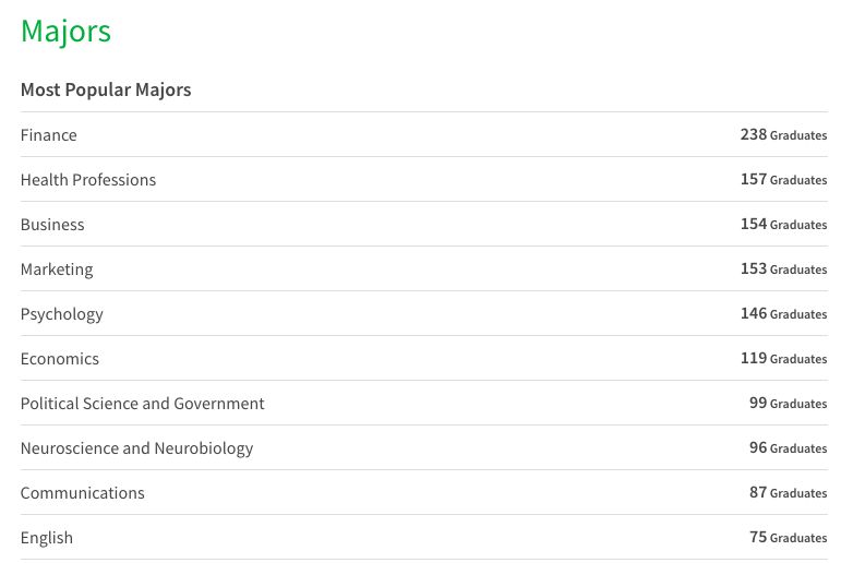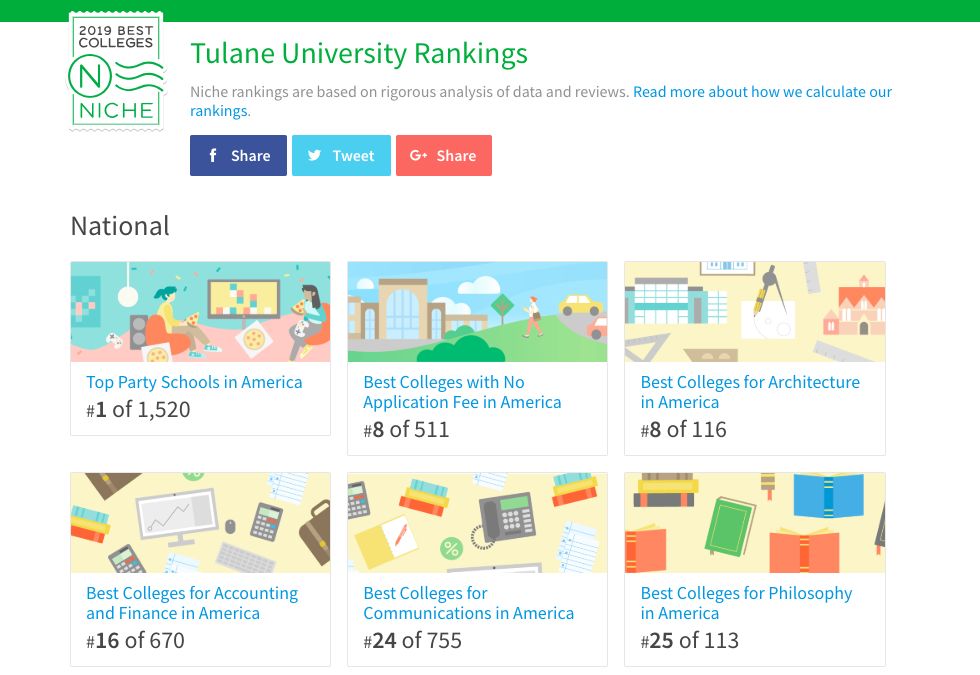 可以看到,最普遍的专业还是Finance,其次是Health Professions,以及Business、Marketing、Psychology。而在Niche上,Tulane最优秀的学科排名如下:Architecture第八名,Accounting&Finance第十六名,Communications第二十四名,Philosophy二十五名,Business三十三名,以及Biology三十七名。