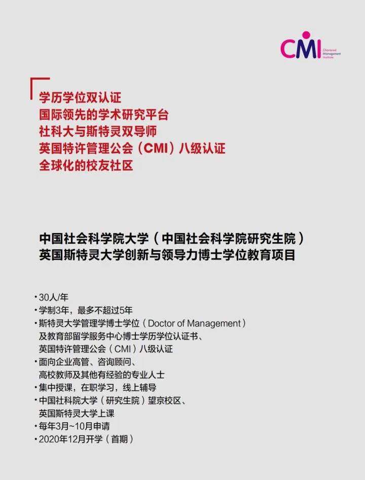 中国社科院-英国斯特灵大学合办管理学博士项目2020级首期班8月提交报名申请、9月集中面试、12月开学,欢迎报名咨询。