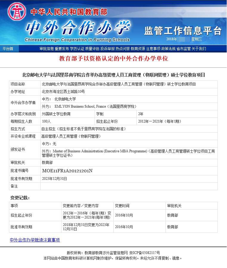将 获得中国北京邮电大学学业证书及法国里昂商学院颁发的高级工商管理硕士学位(Executive MBA)证书,
