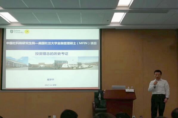 2017年11月18日至19日,中国社会科学院研究生院-杜兰大学金融管理硕士项目(MFIN)在深圳校区举办了四场《金融管理案例分析》课程讲座。本次课程师资阵容十分强大,18日上午由何帆教授为大家阐述《当前中国经济形势和展望》,下午由深圳市金信基金总经理殷克胜先生与大家分享《股海淘金与生存之道》,19日上午由深圳市德瑞丰投资管理有限公司董事长杨孚平先生带来《投资理念的历史考证》,19日下午由深圳证券交易所上市推广部副总监兰邦华先生讲解《多层次资本市场与中小企业发行上市》。